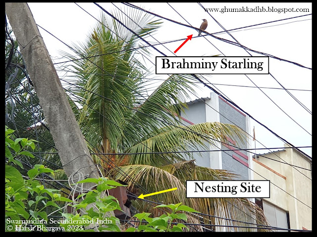Another bird nesting in our neighbourhood in the cable junction box is Brahminy Starling or Brahminy Mynah. The pair have selected an abandoned junction box of cable TV wires. It is mounted at a height on an electric pole. Therefore, safe from predators like stray cats. Brahminy Starlings are generally seen in pairs. See the pictures below: